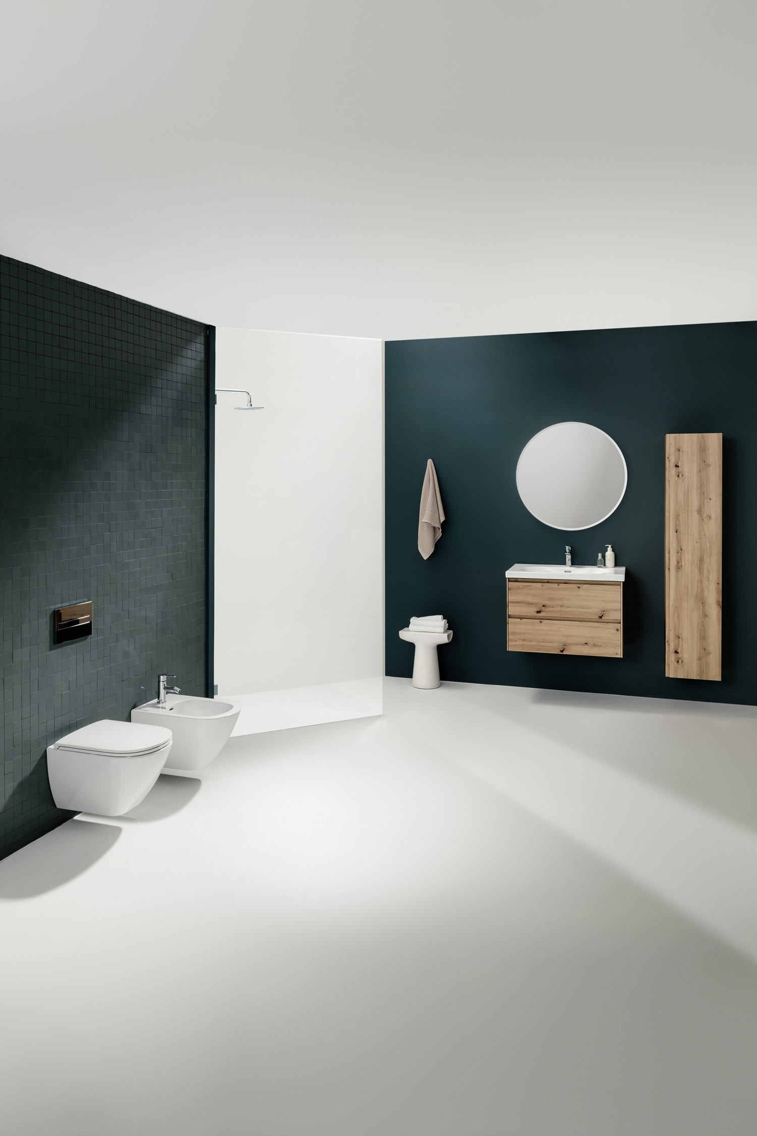 È inoltre disponibile una bacinella da appoggio di 500 mm perfetta per le configurazioni con rubinetto a muro. Tutti i lavabi che compongono la collezione sono disponibili nei colori bianco e bianco LCC.