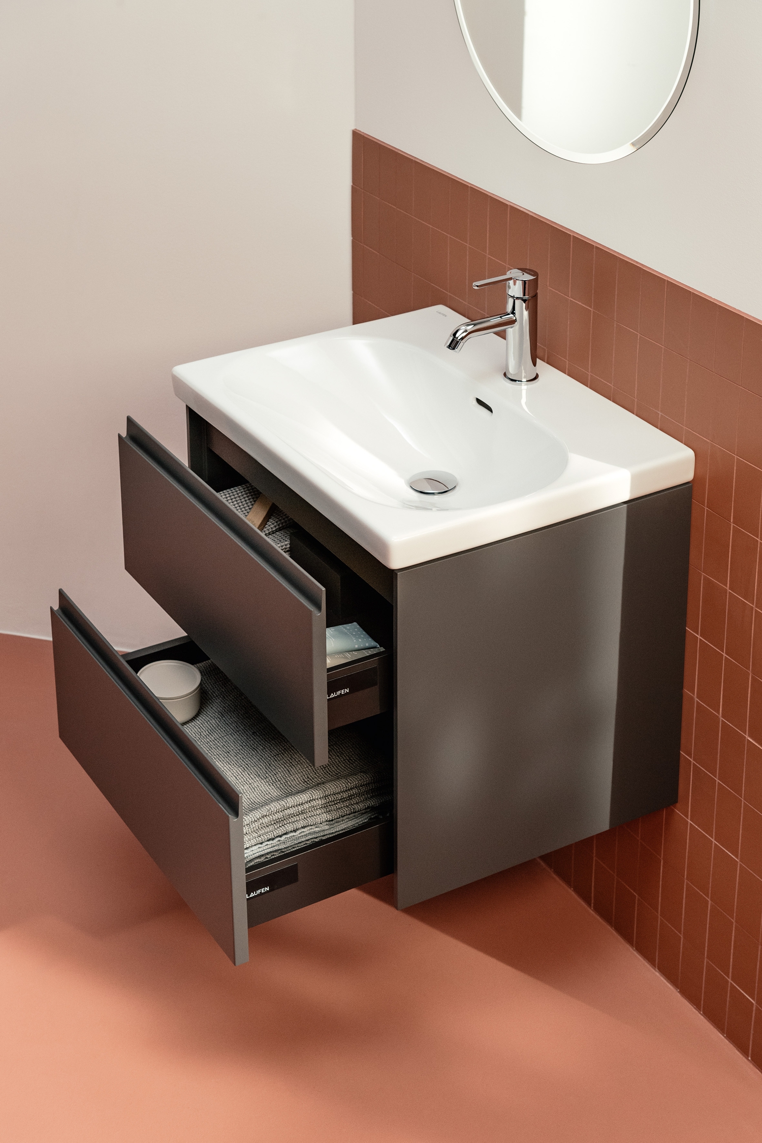 LUA offre inoltre un lavabo rettangolare bianco dalla dimensione contenuta, già premontato con mobile sottolavabo. Poiché il suo profilo sporge leggermente dal corpo del mobile, l'acqua non può gocciolare sul mobile: una soluzione che dimostra come LAUFEN sia un produttore sempre attento ai minimi dettagli. Lo dimostra anche la finitura lucida di tutto il corpo del lavabo, inclusa la parte inferiore. Il mobile sotto lavabo, dalle pareti estremamente sottili, ha due cassetti senza maniglie che si chiudono perfettamente a filo per un'estetica impeccabile e di altissima qualità.